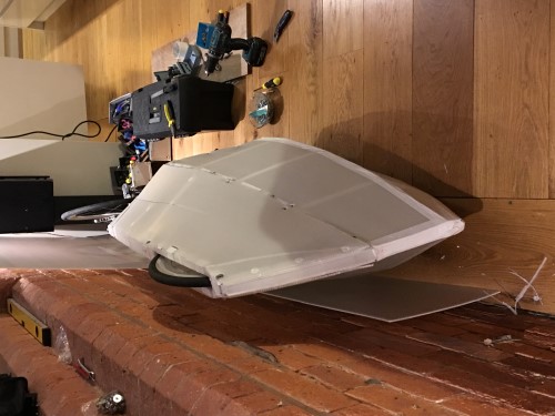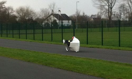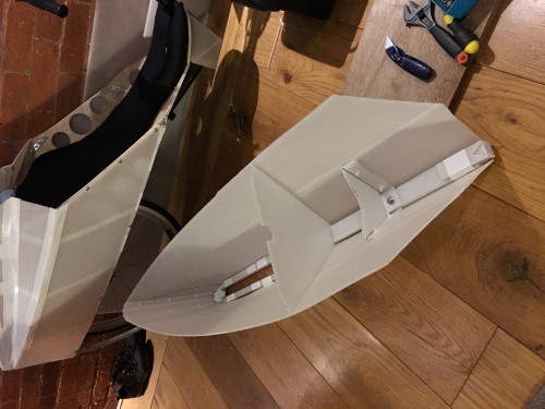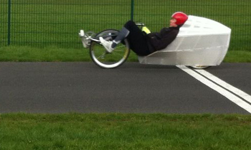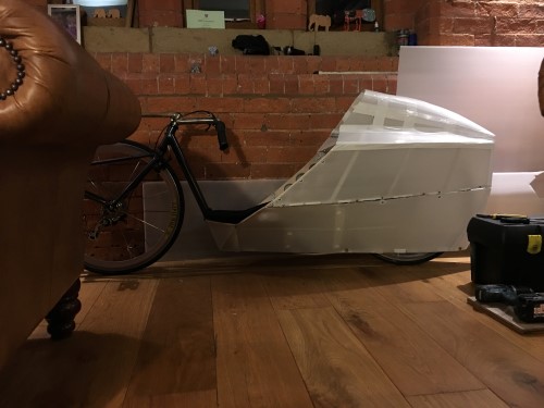 A few more photos showing the bottom bit of the fairing now in place - just needs a run of duct tape around the join. I can pump the tyre up through the hole where my head goes, so I should only have to remove the lower half of the fairing if I get a p*ncture...